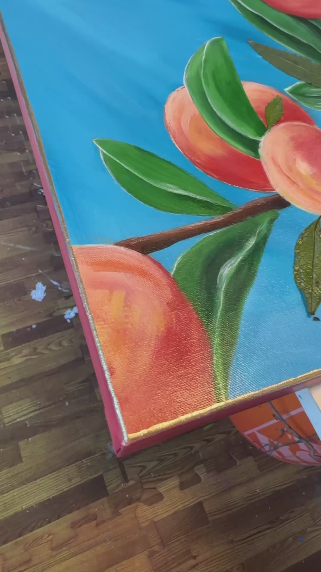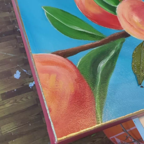 A 30x30" canvas with acrylics, a mix of pressed leaves and painted ones, all sealed in by a resin top coat encasing a peach tree design