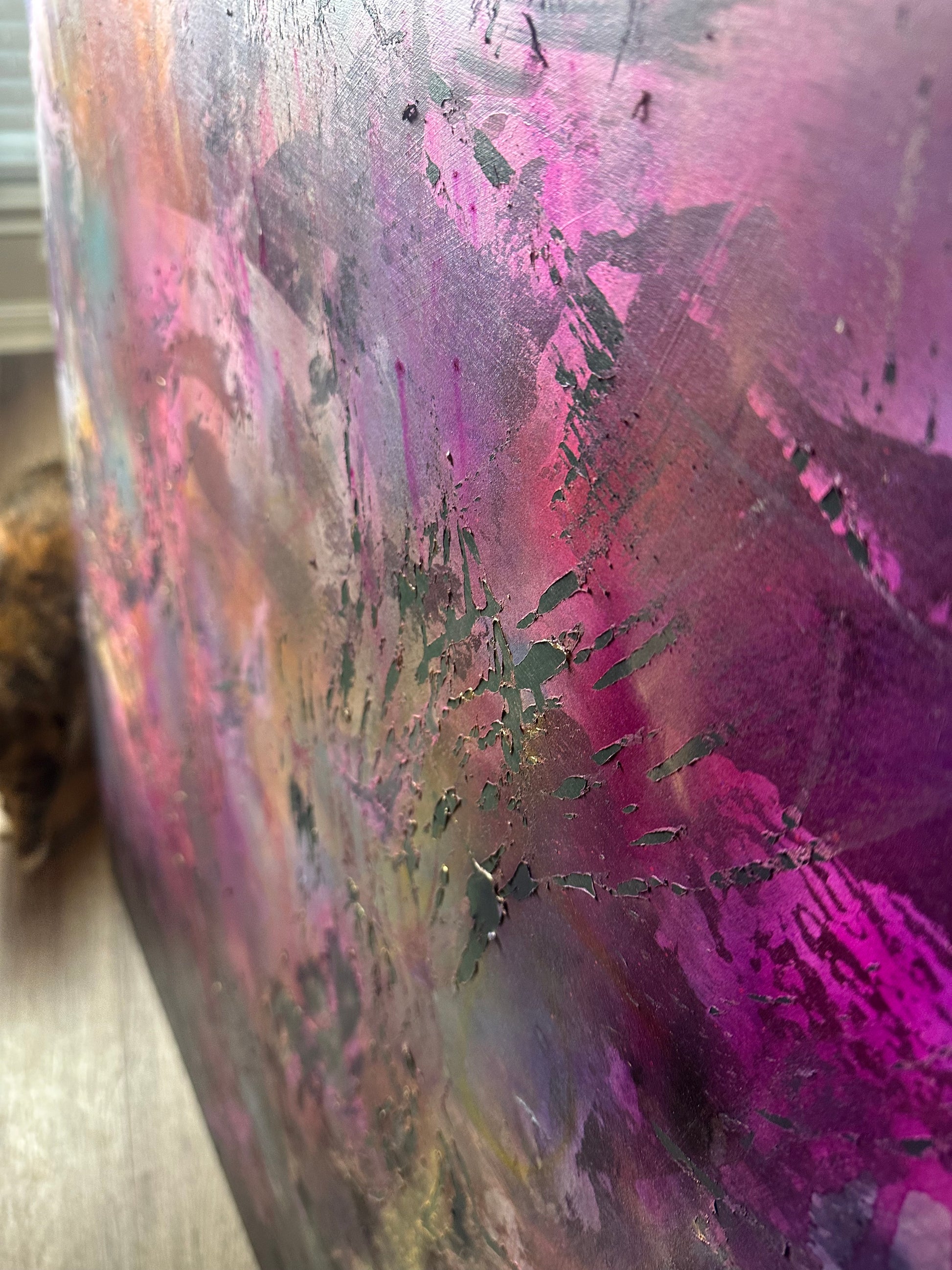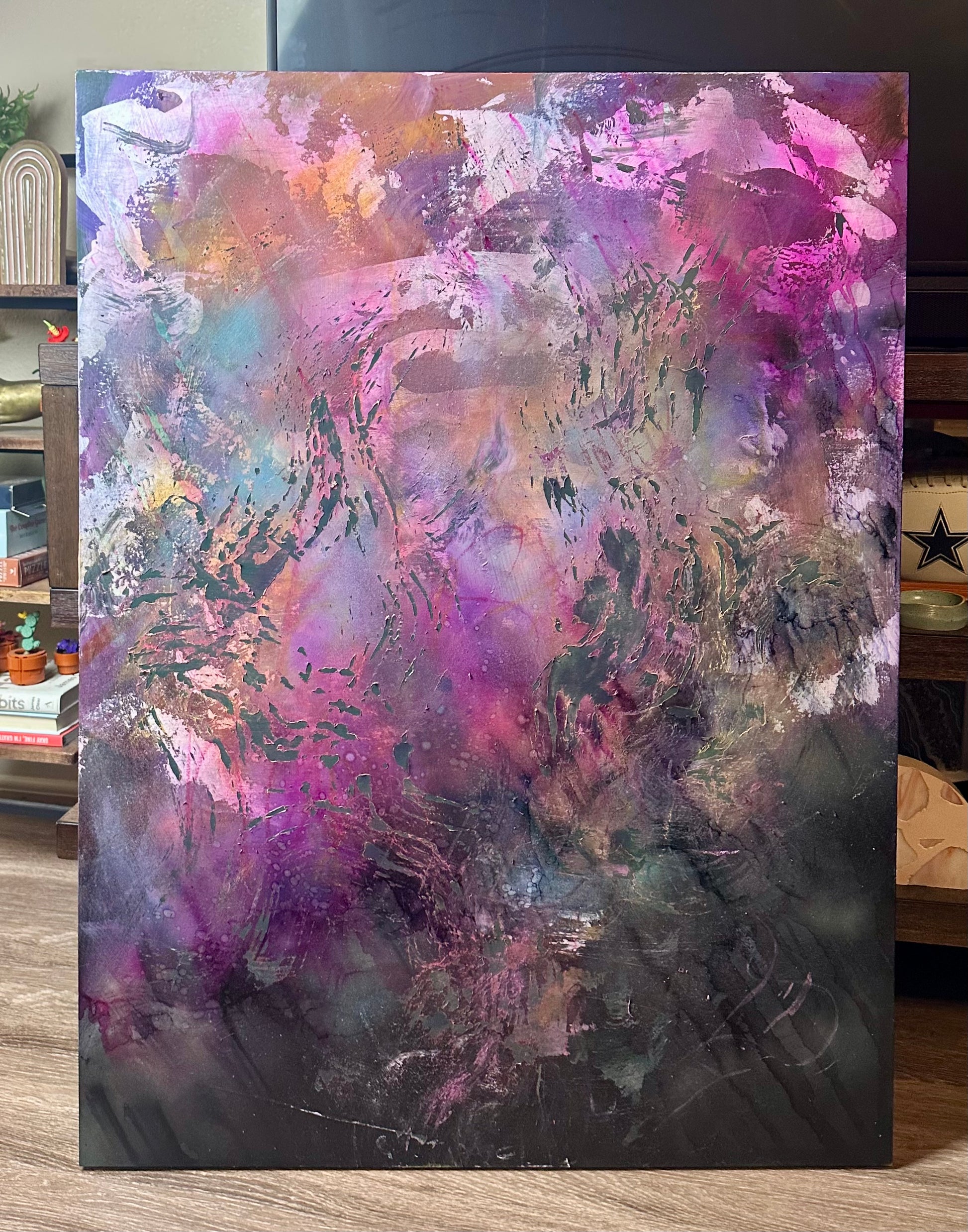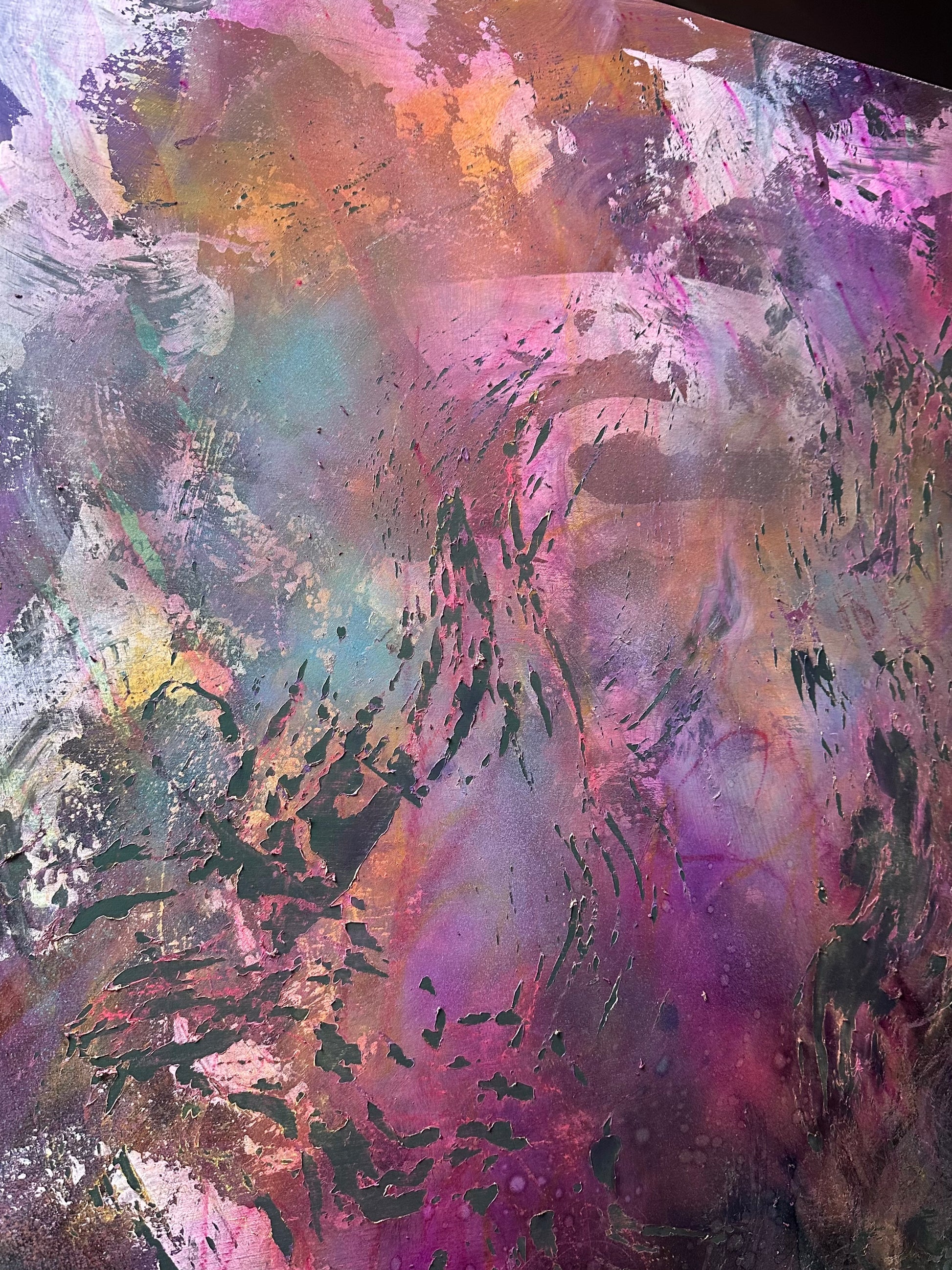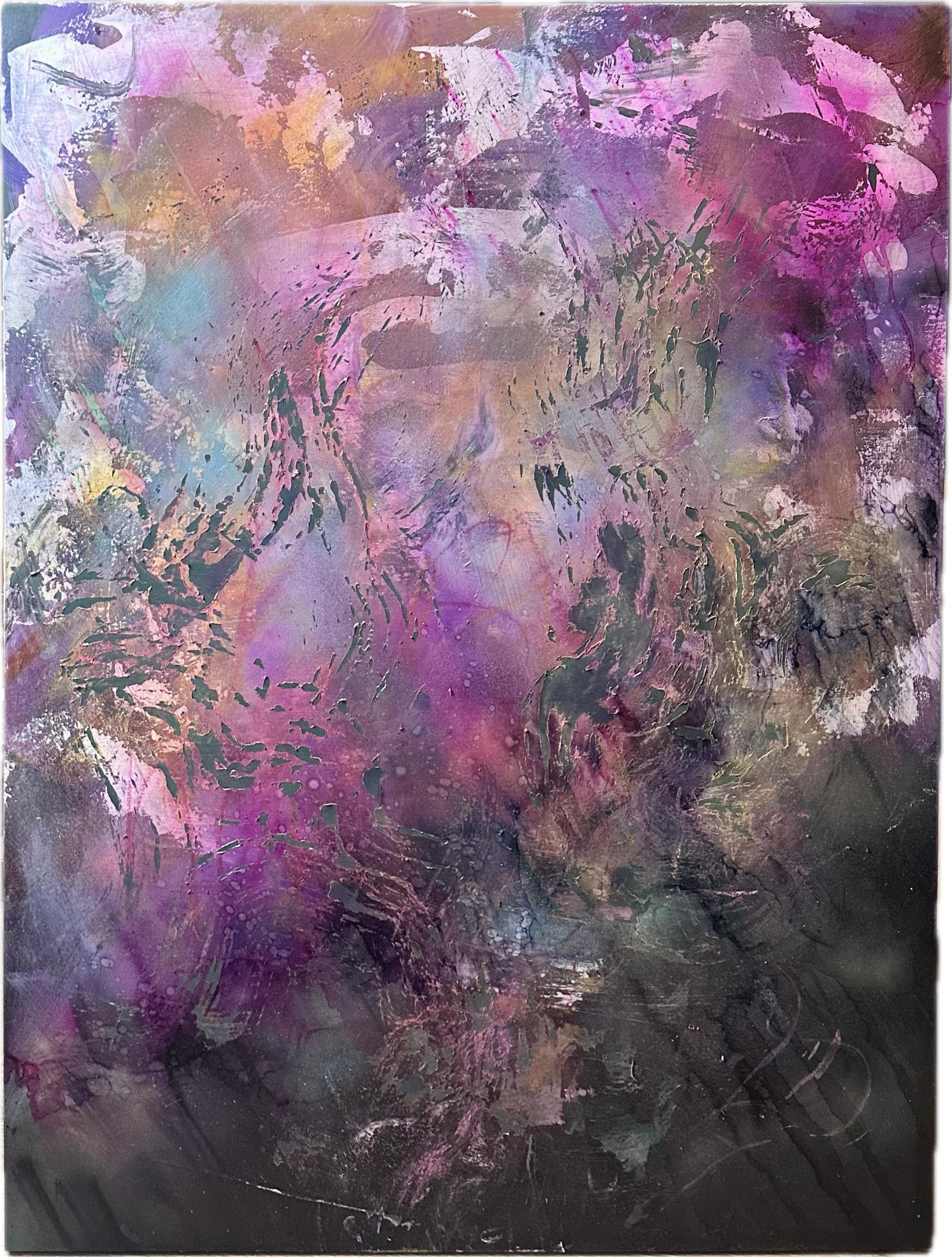 30x40" wood panel wall piece with a concoction of inks, acrylics, spray paints and alcohol.